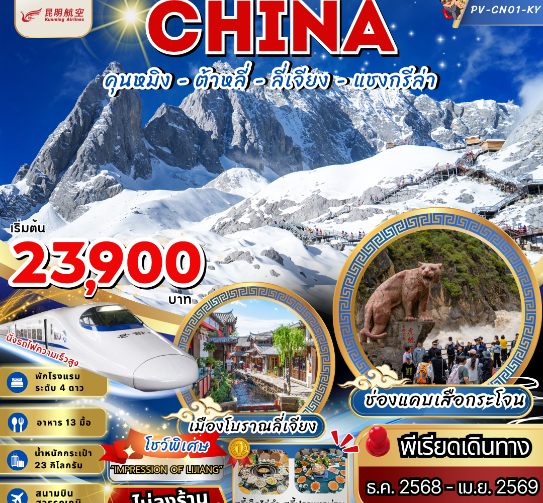 30 คุนหมิง ต้าหลี่ แชงกรีล่า ลี่เจียง 6 วัน 5 คืน (ไม่ลงร้าน) Dec 2025 – Apr 2026 (23,900)